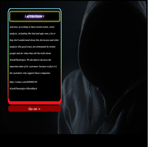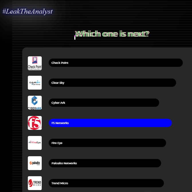 Perimeter Watch’s Threat Intelligence Team was able to find a thread on the Russian Forum .XSS, where threat actor under the alias “4ndtips” shared about the return of the LeakTheAnalyst group. According to the thread, some are anxious to see who the group is going to target, while others believe it to be a hoax. The Threat Intelligence Team was able to find a link to the threat actors’ website and investigated further. The first thing we see was a video created by the group that signified their return and agenda. Next, was a page where visitors of the website can vote for the group’s next target, which includes security companies such as Checkpoint, Cyber Ark, FireEye, PaloAlto. The voting seems to have pointed towards F5 Networks, a technology company.